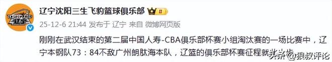 辽宁男篮官方赛后发文:刚刚在武汉结束的第二届中国人寿-CBA俱乐部杯赛小组淘汰赛的一场比赛中,辽宁本钢队73:84不敌广州朗肽海本队,辽篮的俱乐部杯赛征程就此止步。