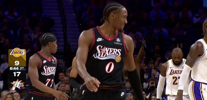 艾顿补篮湖人终于能得分了,马克西拉开单打里弗斯轻松突破抛投得分,艾顿前场篮板再补一球,乔治破防被推飞出去裁判都不吹,回过头来东契奇站上罚球线,这一来一回就能体现裁判的吹罚艺术不想比赛过早失去悬念!格莱姆斯接球失误,八村塁三分有了分差回到4分,马克西突破没有但是德拉蒙德补中,里弗斯突破抛投没有,马克西飞速反击里弗斯身后下手没吹,前者暴怒抱怨裁判比赛进入暂停,东契奇技术犯规罚中,球权还在76人手里,沃克抬手三分飚中东契奇力克回敬,21-26依旧落后5分!恩比德内线打海斯球又被破坏出界,继续进攻尝试三分没有,詹姆斯转换没有,沃克还是投三分没有打成,詹姆斯这次快攻有了,恩比德两罚,八村塁中距离,詹姆斯暴扣,格莱姆斯两罚,八村塁三分首节打完双方打成30平!